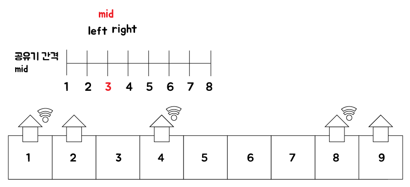 left = mid + 1 로 범위를 또 좁혀 줍니다. 그럼 mid 는 3이 되고, 집의 설치를 진행 하면, 좌표 1, 좌표 4, 좌표 8의 설치 할 수 있습니다. 더 탐색할 수 있는 범위가 없으므로 mid 값 3을 반환 합니다.